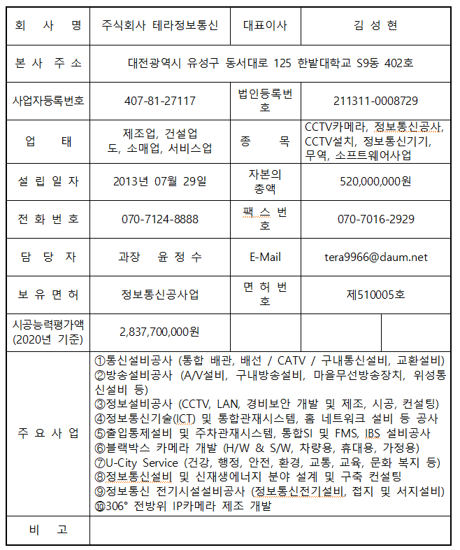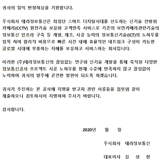현재, 그리고 미래의 정보통신 역사를 창조하고 아름다운 공간을 건설하는 『주식회사 테라정보통신』 이 되겠습니다.